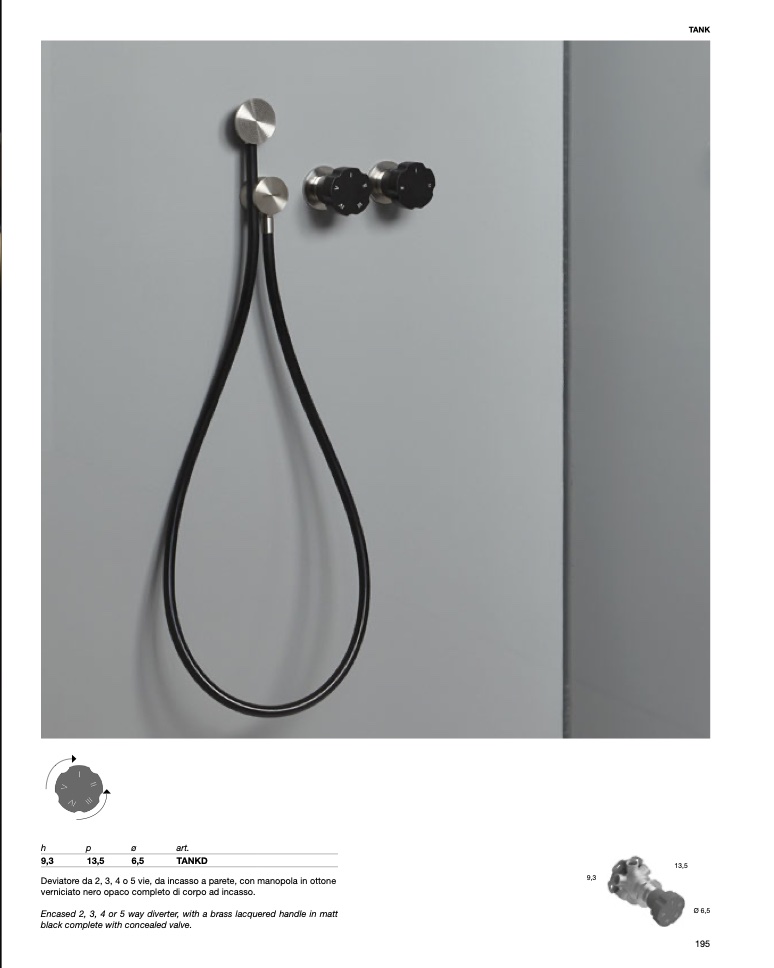 Encased 2, 3, 4 or 5 way diverter, with a brass lacquered handle in matt