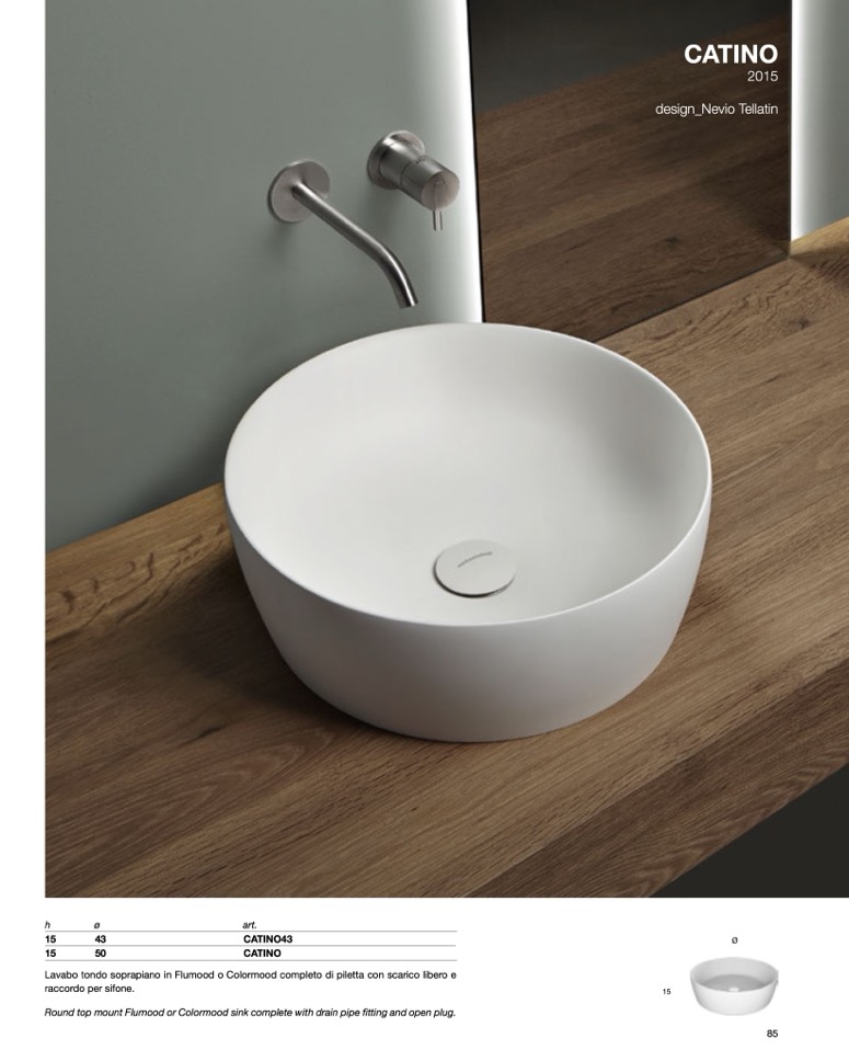 Lavabo tondo soprapiano in Flumood o Colormood completo di piletta con scarico libero e