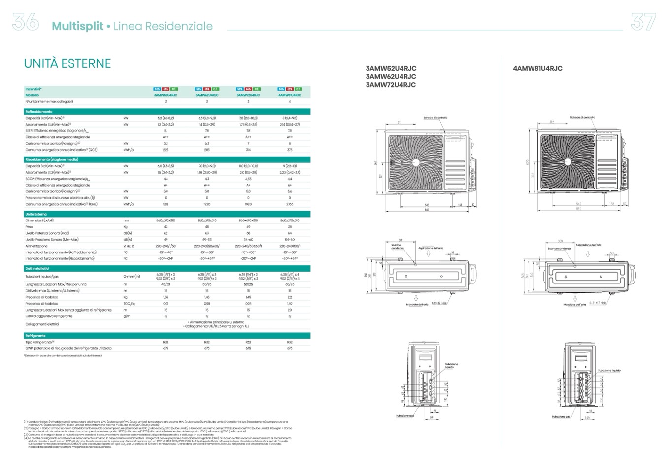 ( 1 ) Condizioni di test (raffreddamento): temperatura aria interna 27°C (bulbo secco)/19°C (bulbo umido); temperatura aria esterna 35°C (bulbo secco)/24°C (bulbo umido). Condizioni di test (riscaldamento): temperatura aria