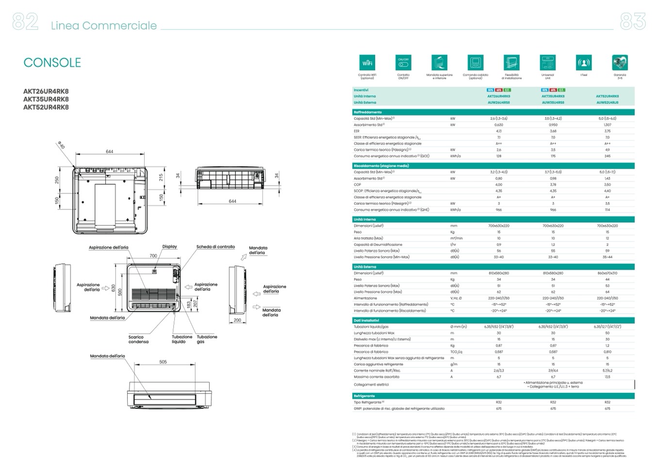 (1) Condizioniditest(raffreddamento):temperaturaariainterna27°C(bulbosecco)/19°C(bulboumido);temperaturaariaesterna35°C(bulbosecco)/24°C(bulboumido).Condizioniditest(riscaldamento):temperaturaariainterna20°C