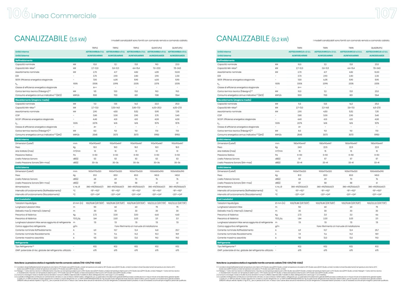 (1) Condizioni di test (raffreddamento): temperatura aria interna 27°C (bulbo secco)/19°C (bulbo umido); temperatura aria esterna 35°C (bulbo secco)/24°C (bulbo umido). Condizioni di test (riscaldamento): temperatura aria interna 20°C
