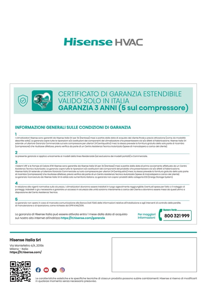 descritte sotto). La garanzia copre tutte le riparazioni e/o sostituzioni dei componenti del climatizzatore che presentassero vizi e/o difetti di fabbricazione. Hisens