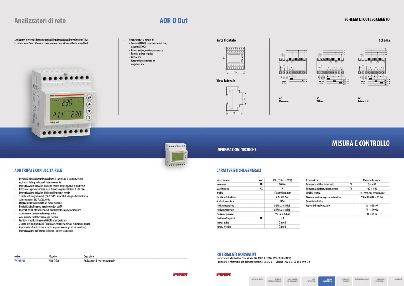 • 2 uscite relé programmabili (2 A / 250 V) associabili alle grandezze misurate