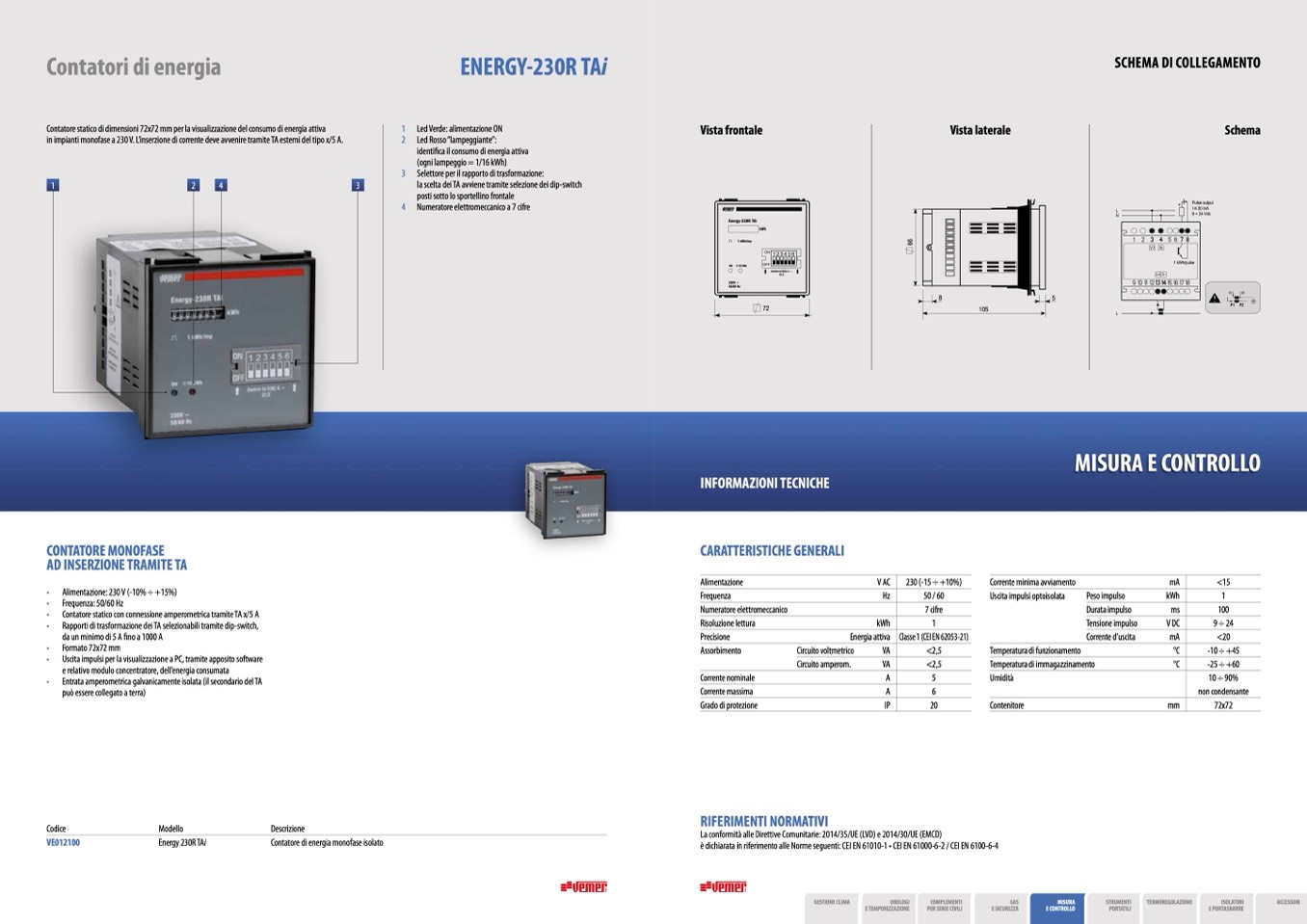 in impianti monofase a 230 V. L’inserzione di corrente deve avvenire tramite TA esterni del tipo x/5 A.