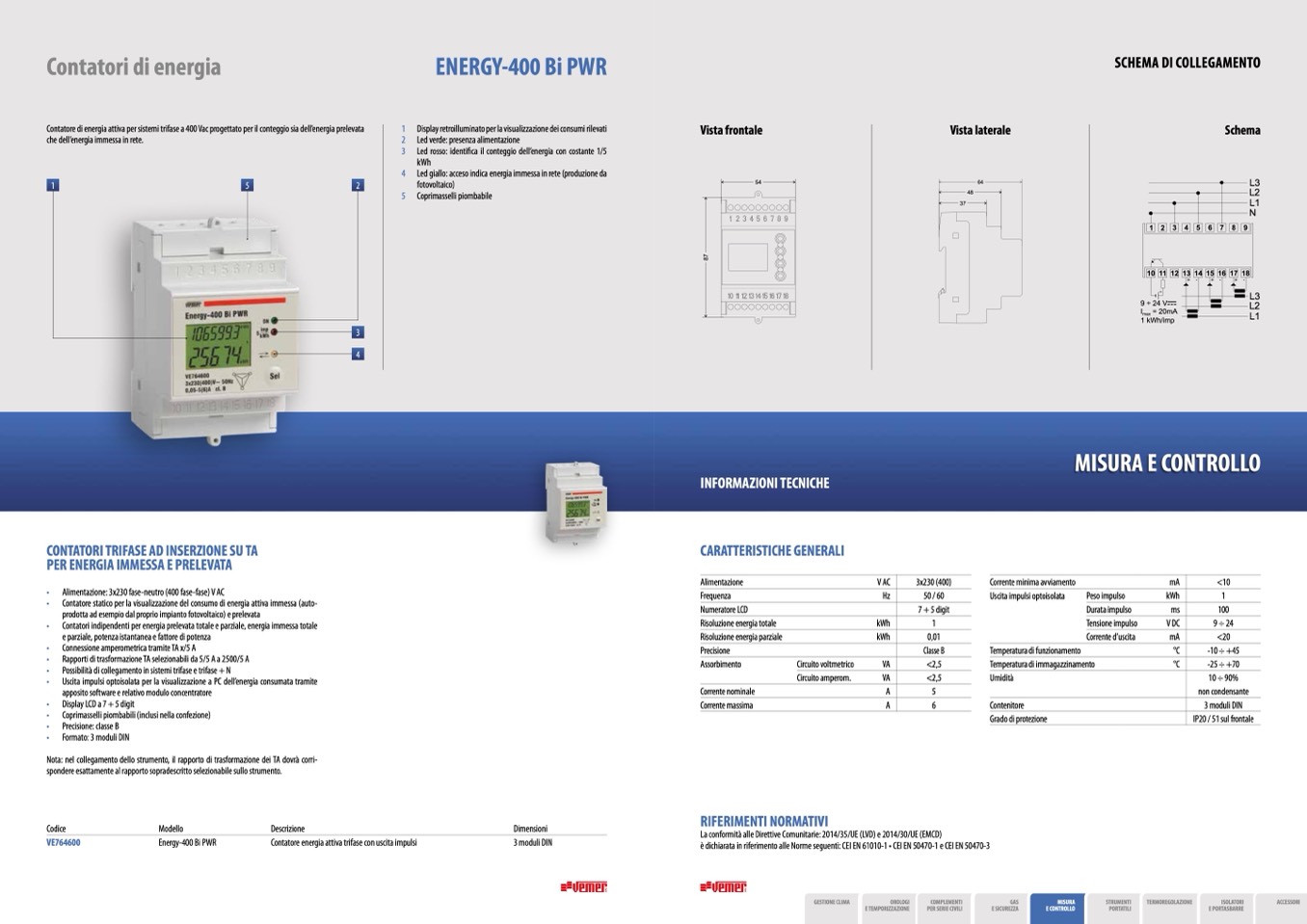 • Uscita impulsi optoisolata per la visualizzazione a PC dell’energia consumata tramite