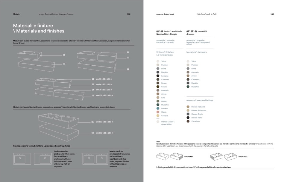 le soluzioni con il lavabo Narciso Mini possono essere composte utilizzando sia il lavabo con bacino destro che sinistro \ the solutions with the