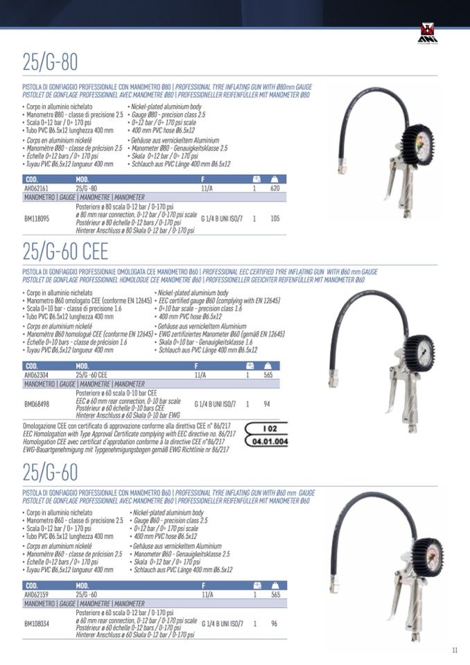 PISTOLA DI GONFIAGGIO PROFESSIONAlE OMOLOGATA CEE MANOMETRO Ø60 | PROFESSIONAL EEC CERTIFIED TYRE INFLATING GUN WITH Ø60 mm GAUGE