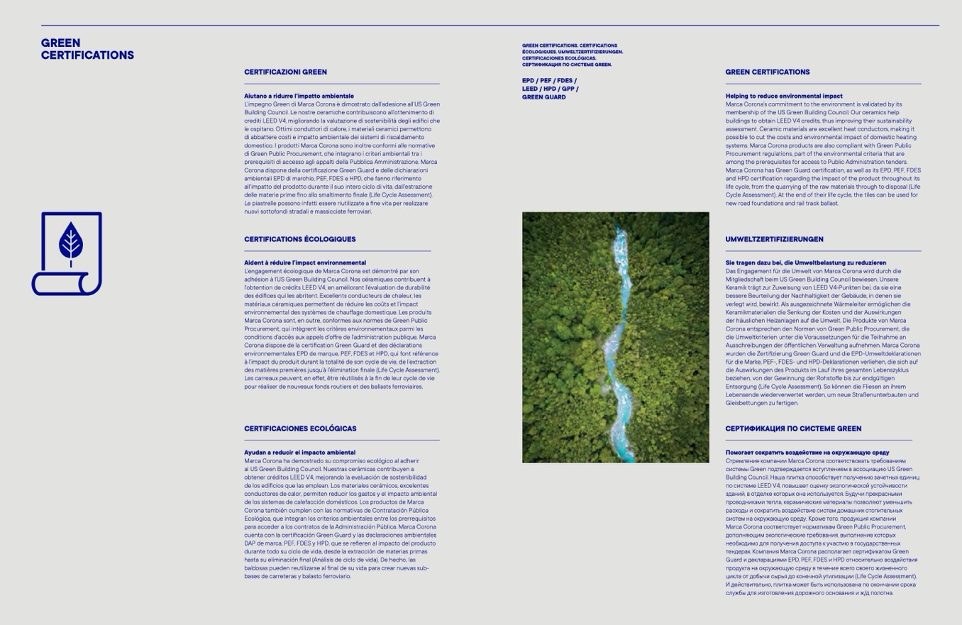 Marca Corona has Green Guard certification, as well as its EPD, PEF, FDES