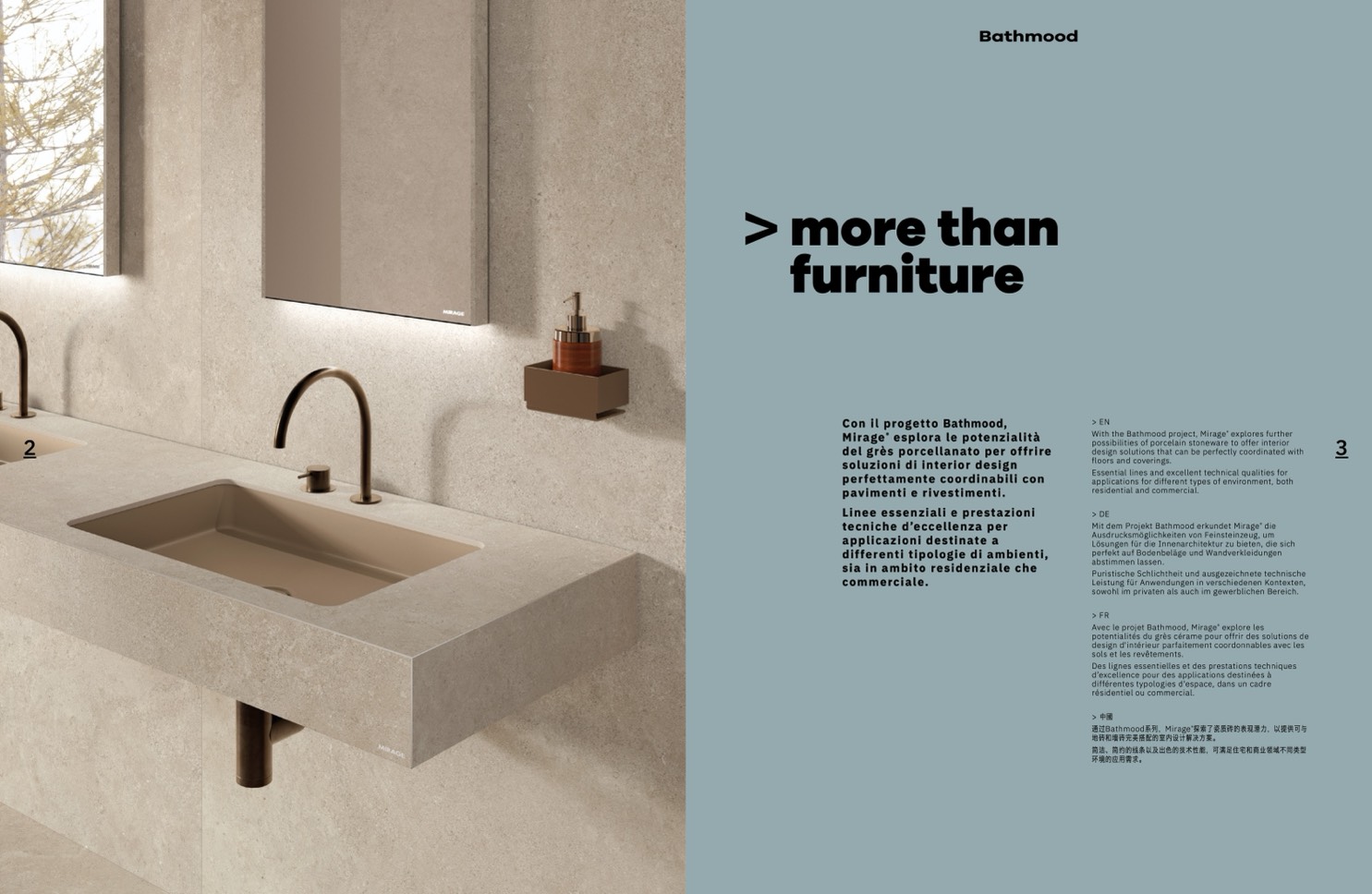 通过Bathmood系列,Mirage®探索了瓷质砖的表现潜力,以提供可与