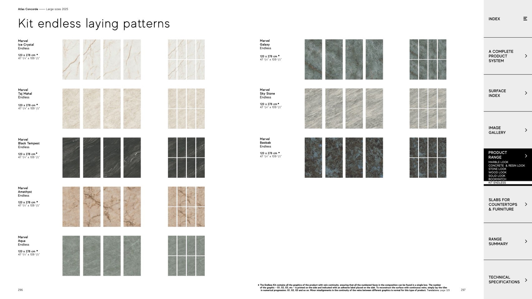 of the graphic – G1, G2, G3, etc – is printed on the side and indicated with an adhesive label placed on the slab. To reconstruct the surface with continuous veins, simply lay the tiles