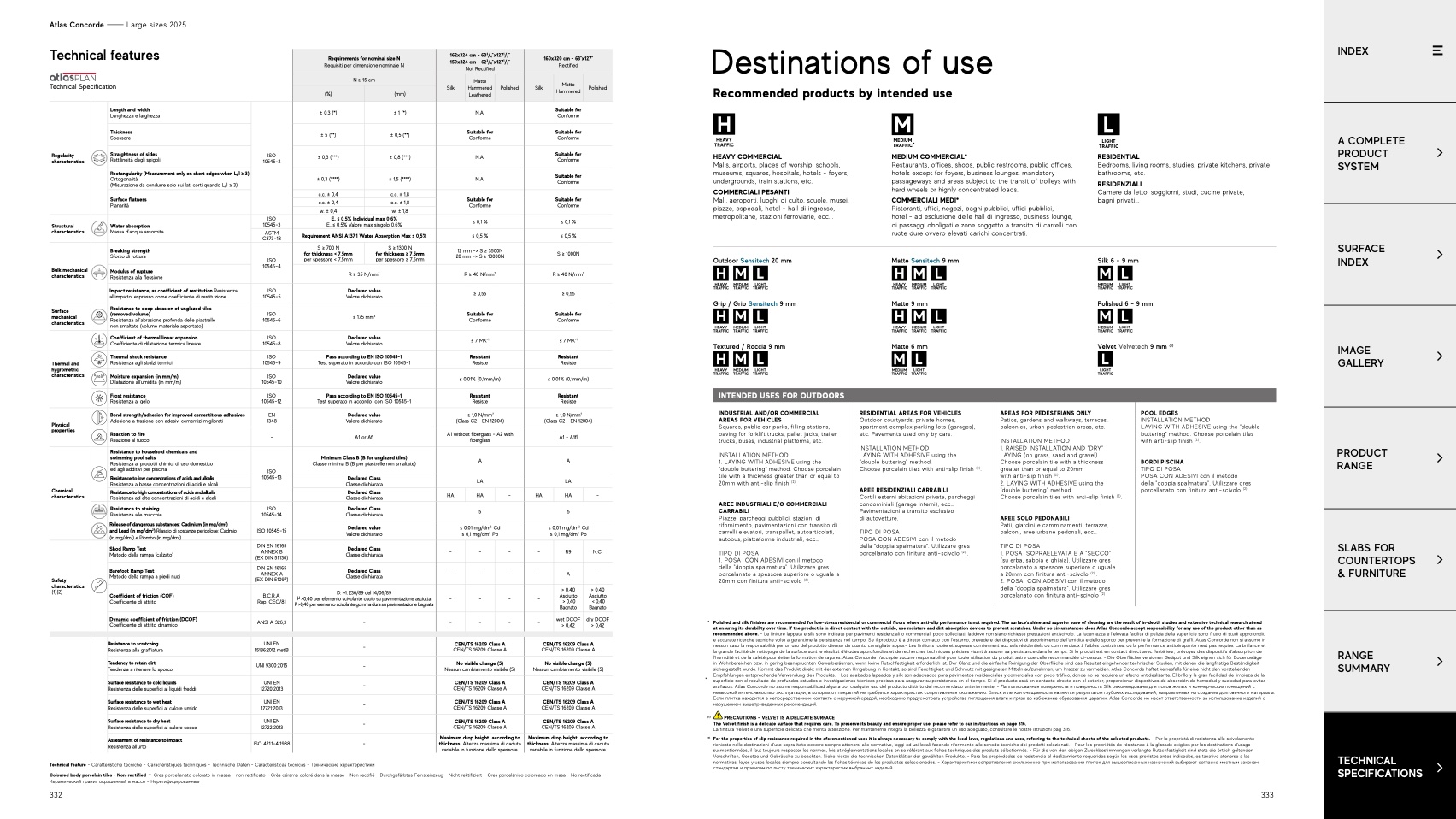 For the properties of slip resistance required in the aforementioned uses it is always necessary to comply with the local laws, regulations and uses, referring to the technical sheets of the selected products. - Per le proprietà di resistenza allo scivolamento