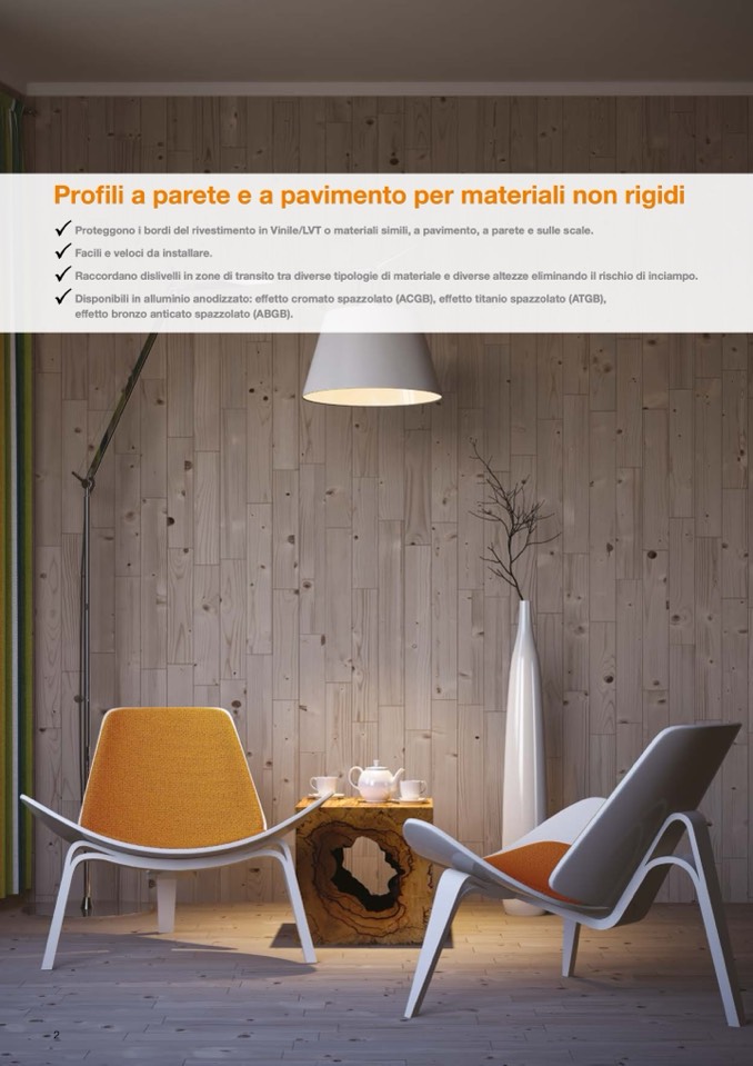 Proteggono i bordi del rivestimento in Vinile/LVT o materiali simili, a pavimento, a parete e sulle scale.