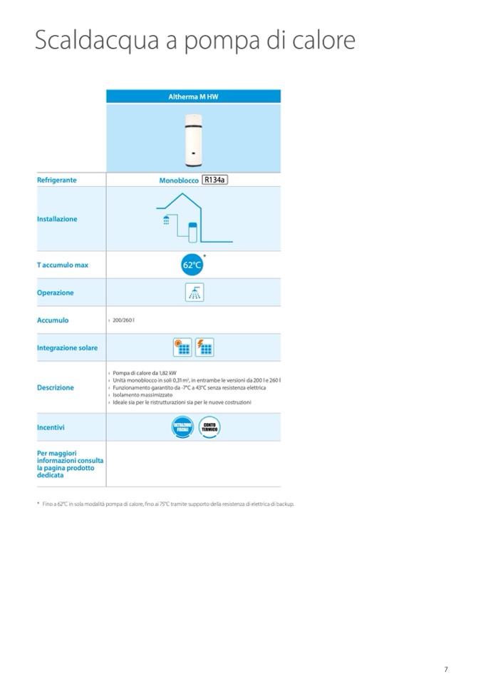Fino a 62°C in sola modalità pompa di calore, fino ai 75°C tramite supporto della resistenza di elettrica di backup