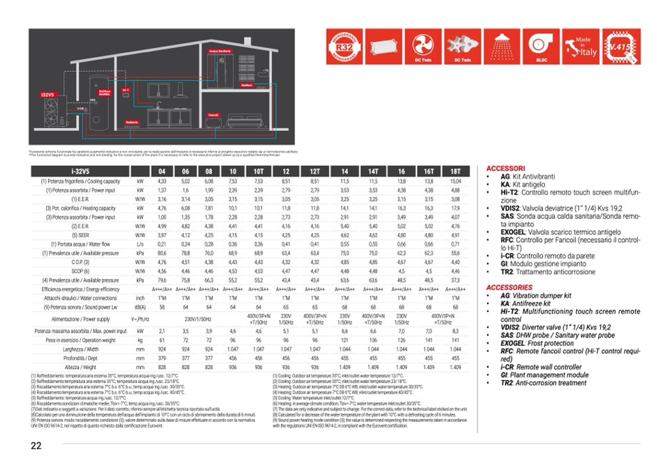 (1) Raffreddamento: temperatura aria esterna 35°C; temperatura acqua ing./usc. 12/7°C.