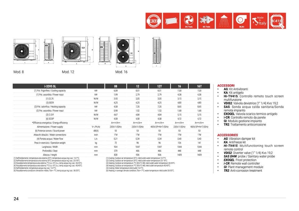 (1) Raffreddamento: temperatura aria esterna 35°C; temperatura acqua ing./usc. 12/7°C.