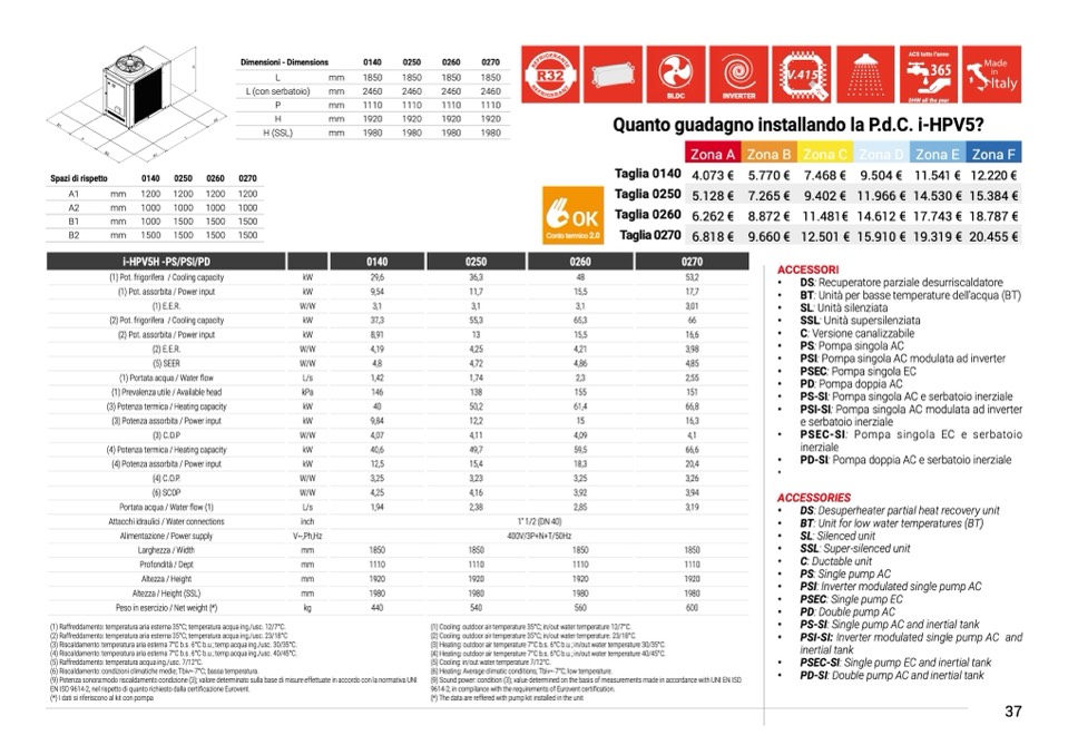 (1) Raffreddamento: temperatura aria esterna 35°C; temperatura acqua ing./usc. 12/7°C.