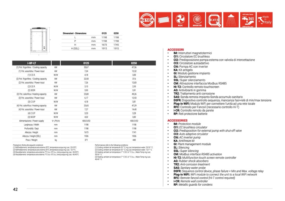 (1) Raffreddamento: temperatura aria esterna 35°C; temperatura acqua ing./usc. 23/18°C.