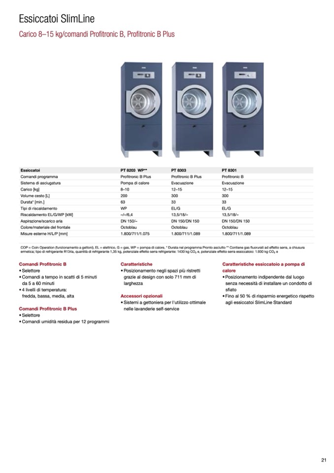 COP = Coin Operation (funzionamento a gettoni), EL = elettrico, G = gas, WP = pompa di calore, * Durata nel programma Pronto asciutto ** Contiene gas fluorurati ad effetto serra, a chiusura