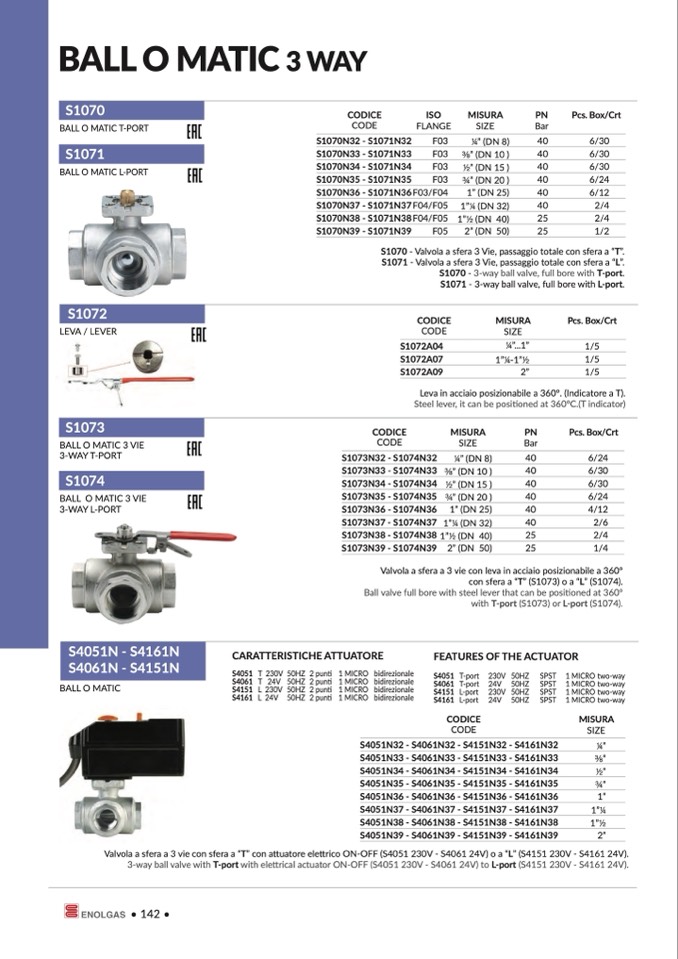 S1071 - Valvola a sfera 3 Vie, passaggio totale con sfera a “L”.