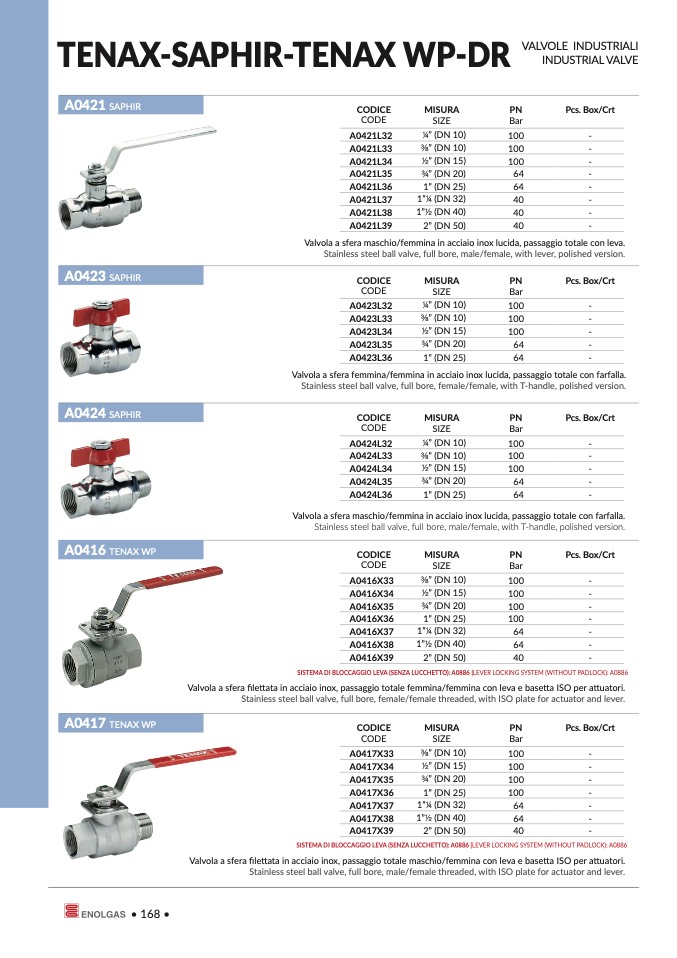 Valvola a sfera filettata in acciaio inox, passaggio totale maschio/femmina con leva e basetta ISO per attuatori.