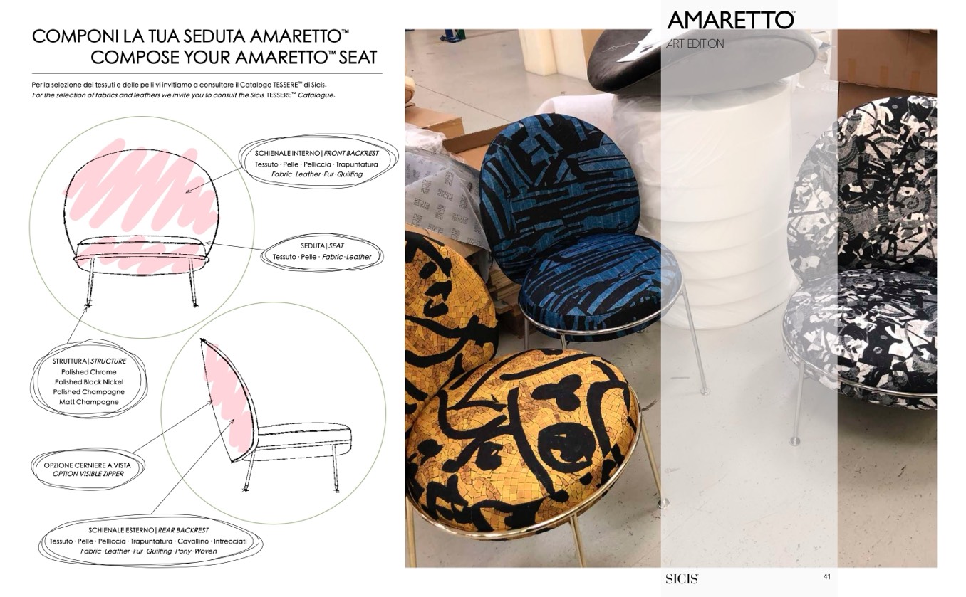 Per la selezione dei tessuti e delle pelli vi invitiamo a consultare il Catalogo TESSERETM di Sicis.