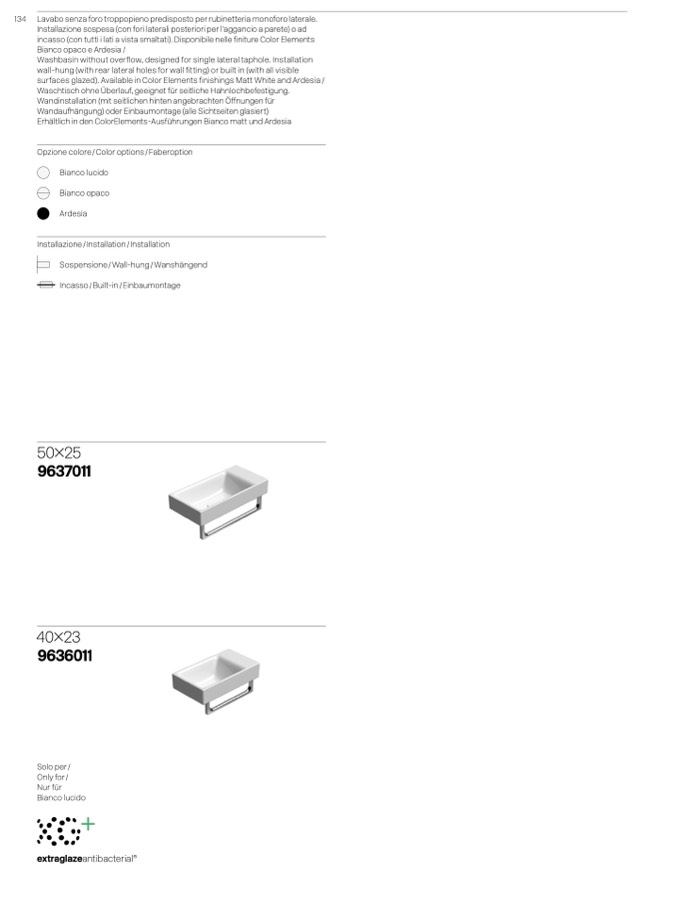 134 Lavabo senza foro troppopieno predisposto per rubinetteria monoforo laterale.