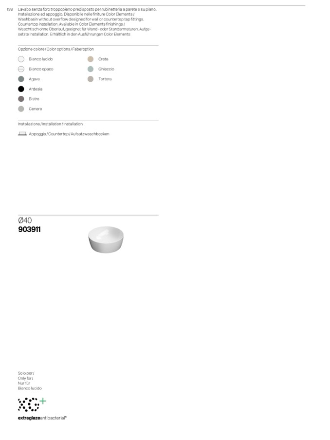 Installazione ad appoggio. Disponibile nelle finiture Color Elements /