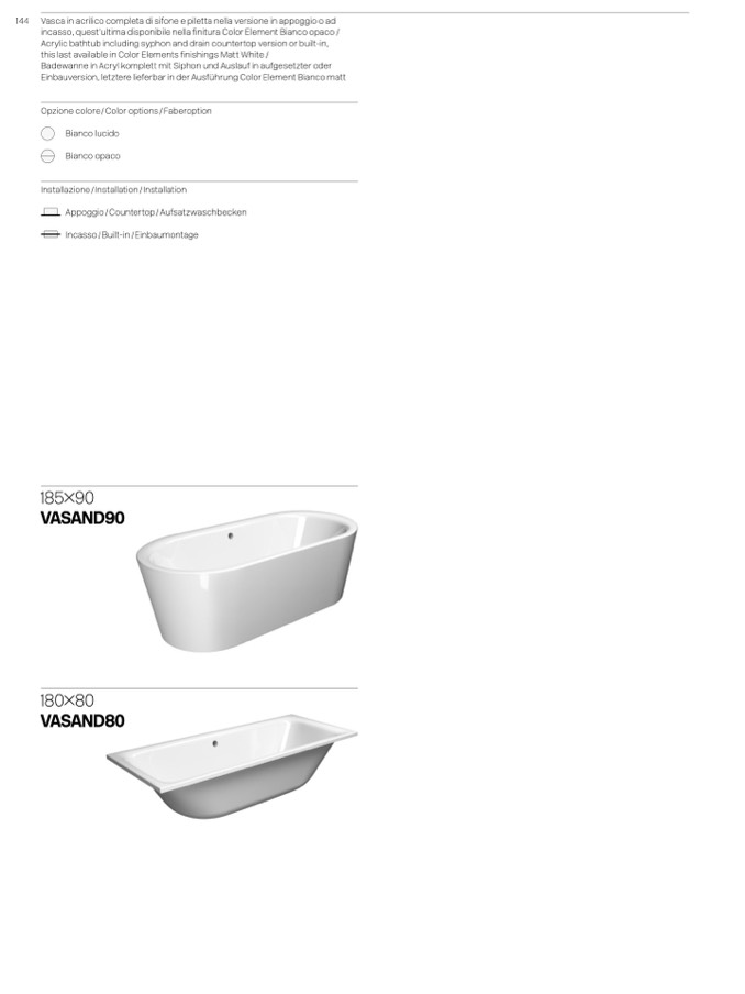 144 Vasca in acrilico completa di sifone e piletta nella versione in appoggio o ad