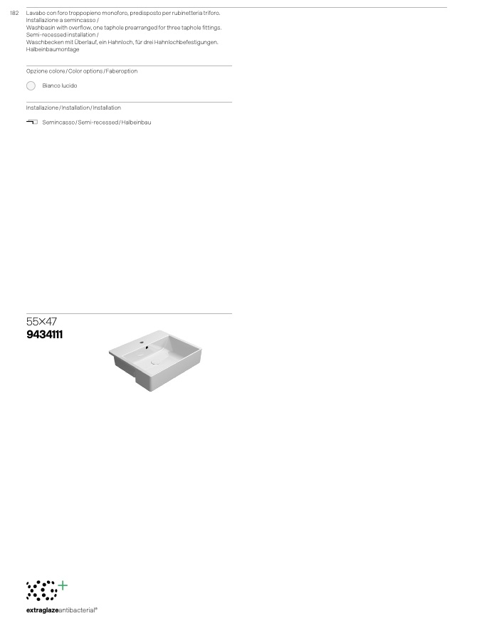 182 Lavabo con foro troppopieno monoforo, predisposto per rubinetteria triforo.