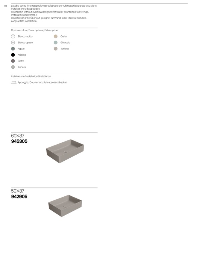 Lavabo senza foro troppopieno predisposto per rubinetteria a parete o su piano.