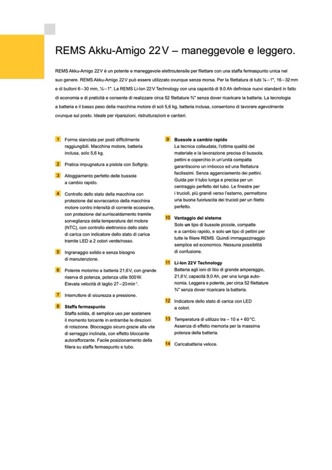 suo genere. REMS Akku-Amigo 22 V può essere utilizzato ovunque senza morsa. Per la filettatura di tubi 1⁄8 – 1", 16 – 32 mm