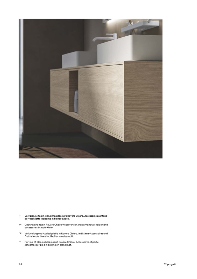 Coating and top in Rovere Chiaro wood veneer. Indissima towel holder and