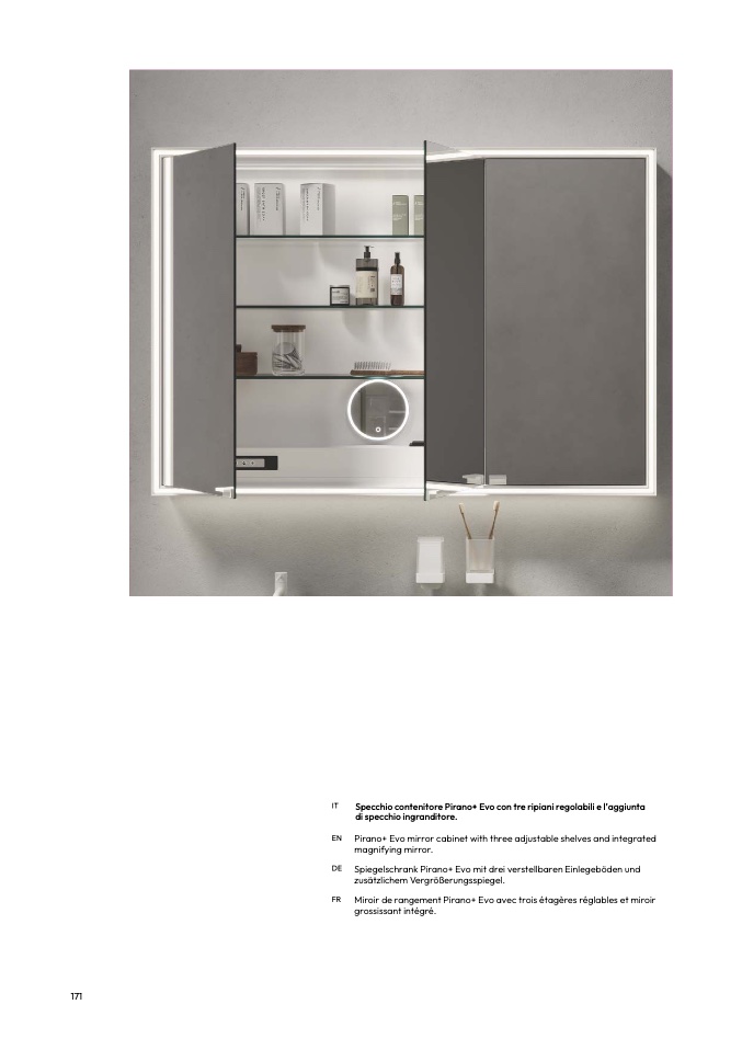Specchio contenitore Pirano+ Evo con tre ripiani regolabili e l’aggiunt