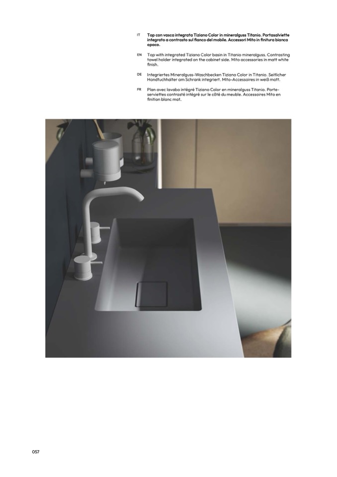 Top with integrated Tiziano Color basin in Titanio mineralguss. Contrastin