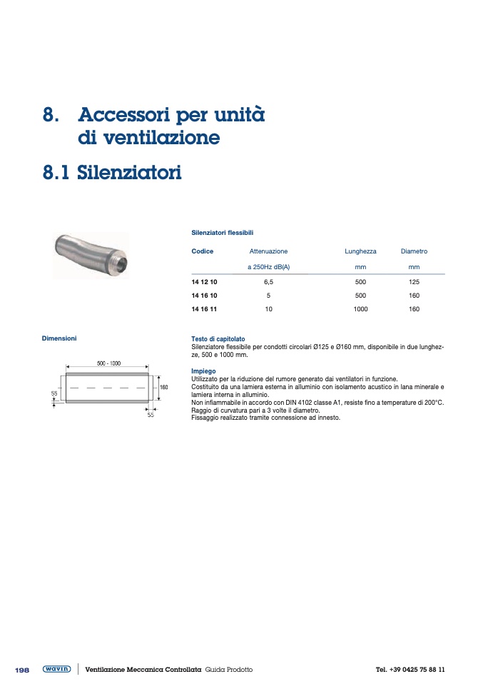 Silenziatore flessibile per condotti circolari Ø125 e Ø160 mm, disponibile in due lunghez-