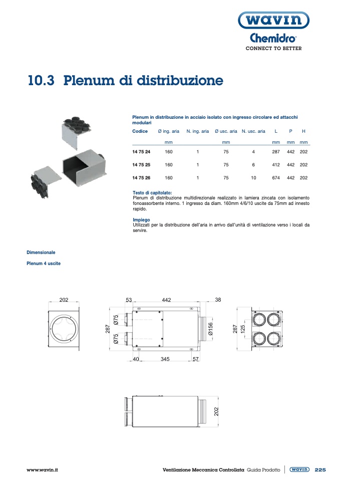 fonoassorbente interno. 1 ingresso da diam. 160mm 4/6/10 uscite da 75mm ad innesto