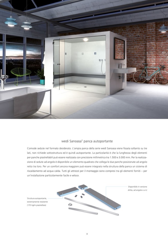 Comode sedute nel formato desiderato. L’ampia panca della serie wedi Sanoasa viene fissata soltanto su tre