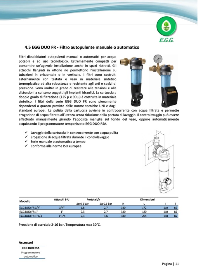standard europei. La pulizia della cartuccia avviene in controcorrente con acqua filtrata e permette
