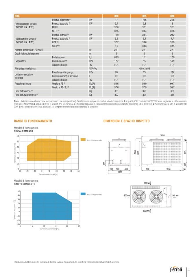 Note: I dati riferiscono alle macchine senza accessori (se non specificato). Far riferimento sempre alla relativa scheda di selezione. 1 Acqua 12/7°C, T. aria est. 35°C 2 Efficienza stagionale in raffrescamento