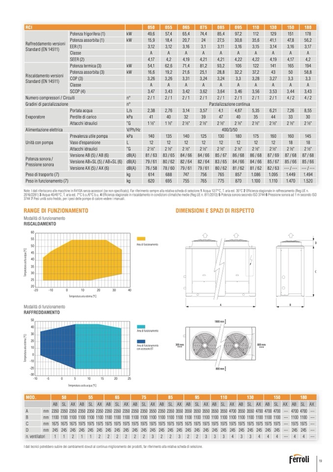 Note:-2I0dati riferiscono alle macchine in R410A senza accessori (se non specificato). Far riferimento sempre alla relativa scheda di selezione.1 Acqua 12/7°C, T. aria est. 35°-C202 Efficienza stagionale in raffrescamento (Reg.UE n.