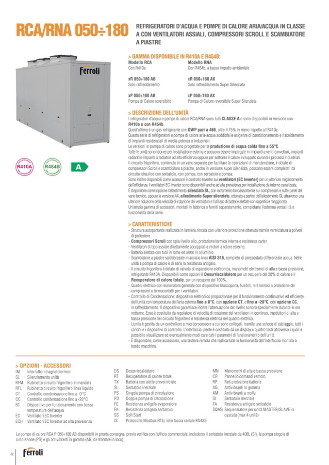 I refrigeratori d’acqua e pompe di calore RCA/RNA sono tutti CLASSE A e sono disponibili in versione con