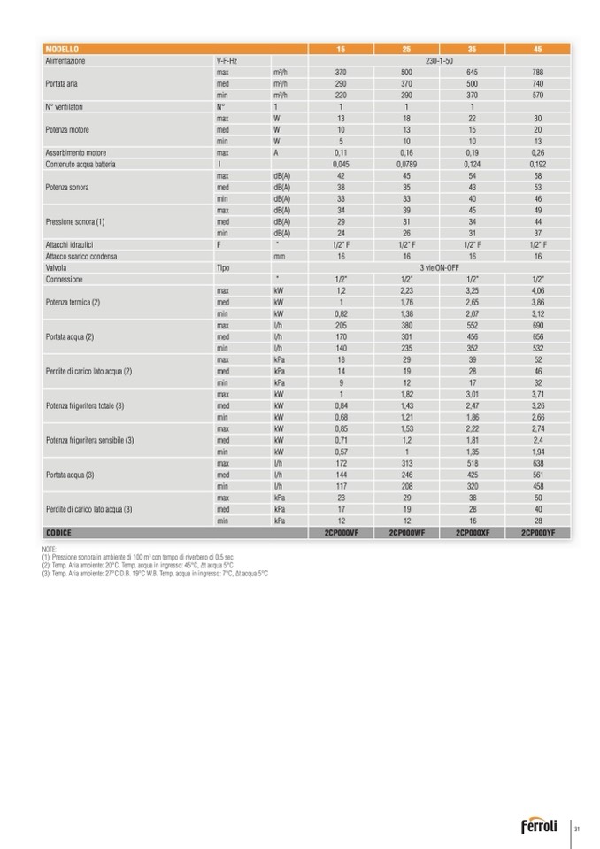 (2): Temp. Aria ambiente: 20°C. Temp. acqua in ingresso: 45°C, ∆t acqua 5°C