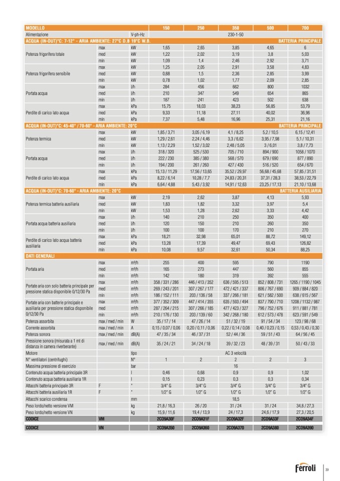 ACQUA (IN-OUT)°C: 45-40° / 70-60° - ARIA AMBIENTE: 20°C - (E) Dati dichiarati secondo il programma di Certificazione Eurovent