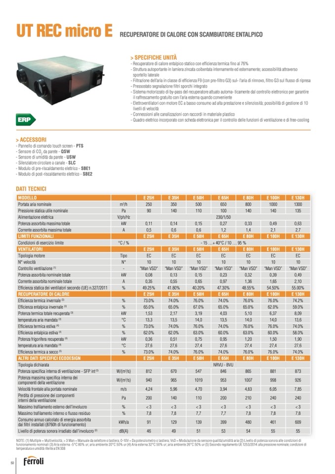 NOTE: (1) Multiple = Multivelocità; > 3 Man = Manuale da selettore o tastiera; 0-10V = Da potenziometro o tastiera; VsD = Modulazione da sensore qualità/umidità aria (2) Livello di potenza sonora alle condizioni di