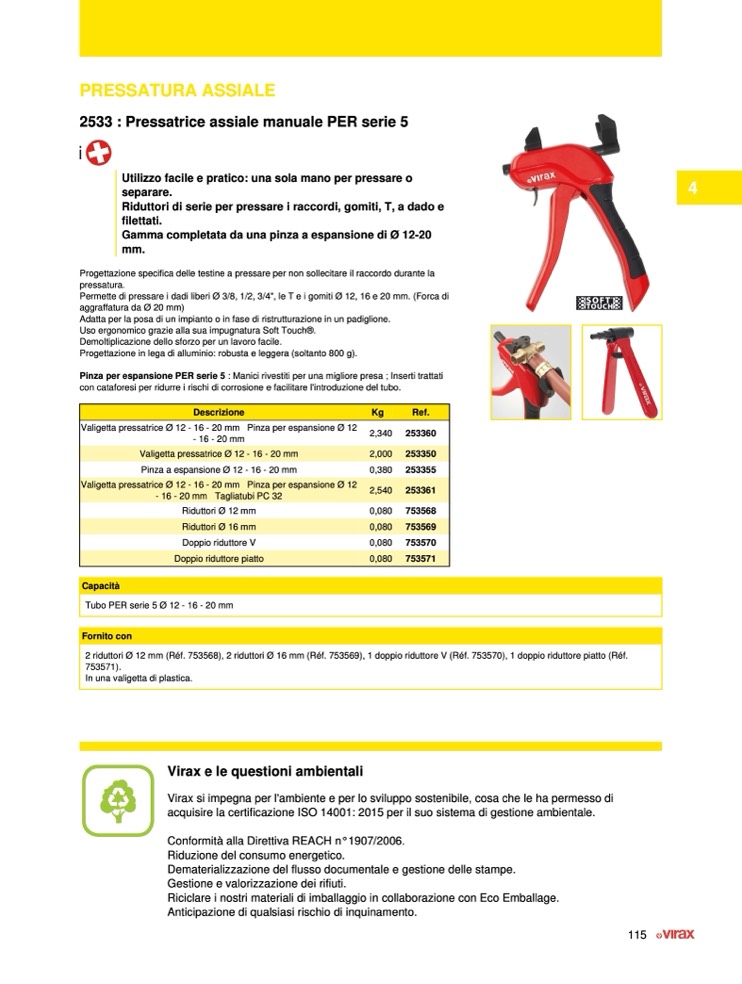 Permette di pressare i dadi liberi Ø 3/8, 1/2, 3/4", le T e i gomiti Ø 12, 16 e 20 mm. (Forca di