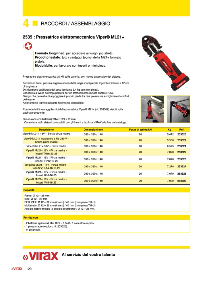 Possiede tutti i vantaggi tecnici della pressatrice Viper® M21+ (rif. 253502) visibili sulla