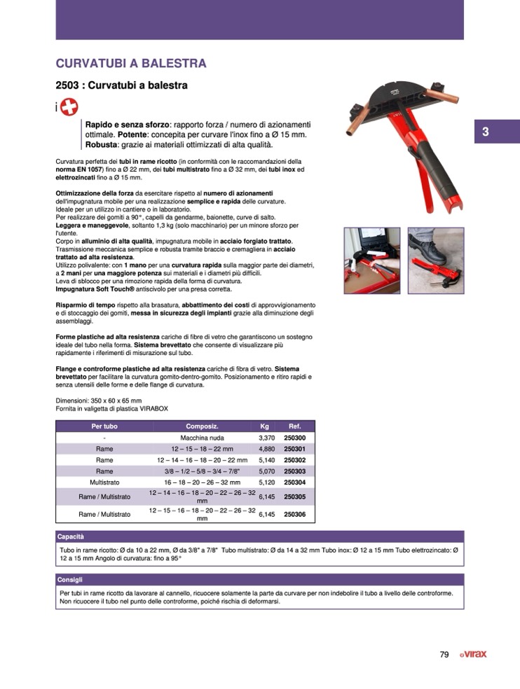 Tubo in rame ricotto: Ø da 10 a 22 mm, Ø da 3/8" a 7/8" Tubo multistrato: Ø da 14 a 32 mm Tubo inox: Ø 12 a 15 mm Tubo elettrozincato: Ø