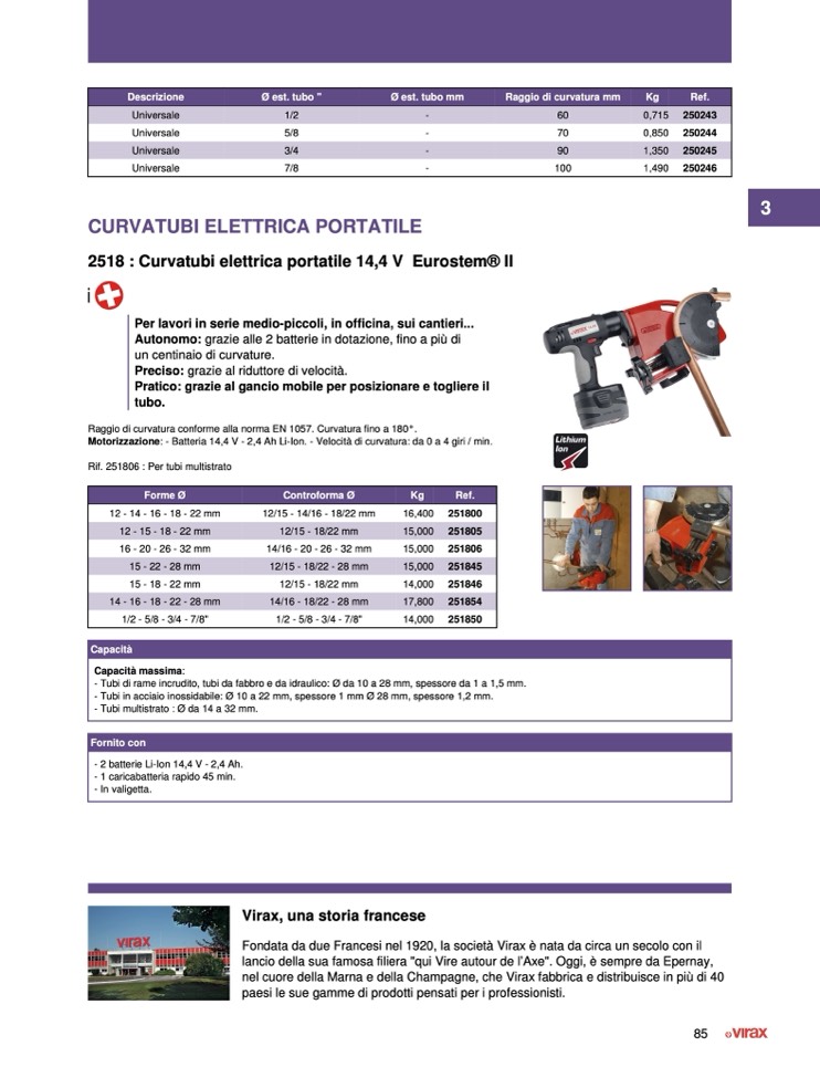Motorizzazione: - Batteria 14,4 V - 2,4 Ah Li-Ion. - Velocità di curvatura: da 0 a 4 giri / min.