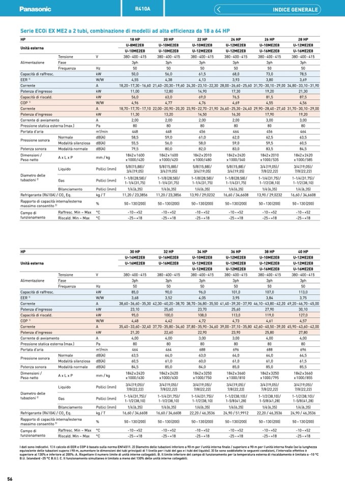 I dati sono indicativi. 1) Il calcolo di EER e COP è basato sulla norma EN14511. 2) Diametro delle tubazioni inferiore a 90 m per l'unità interna finale / superiore a 90 m per l'unità interna finale (se la lunghezza