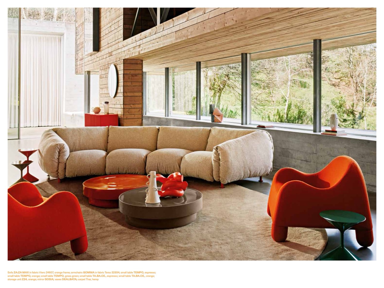 Sofa ZA:ZA MAX in fabric Viero 24607, orange frame; armchairs GOMMA in fabric Terso 32934; small table TEMPO, espresso;